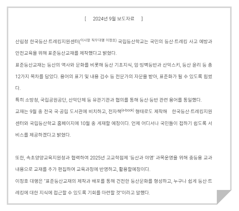 그러한 기준으로 보자면 소위 “표준등 산교재” 는 많은 문제점과 부작용을 내포하고 있다. 본지가 이른바 “표준등산교재”에 대한 해당 전문가의 다양한 의견을 청취한 몇가지 소개 한다.