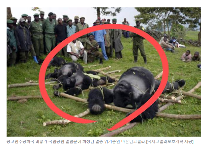 고릴라의 개체 수가 줄어드는 가장 큰 원인은 광물 채취를 위한 서식지 파괴. 휴대폰, 노트북 등 전자기기 속 전자장치를 만드는 데 이용되는 ‘콜탄’의 매장 지역이 고릴라 서식지와 겹치는 영향이다. 이에 고릴라 개체 수는 매년 5%가량 감소하고 있다.