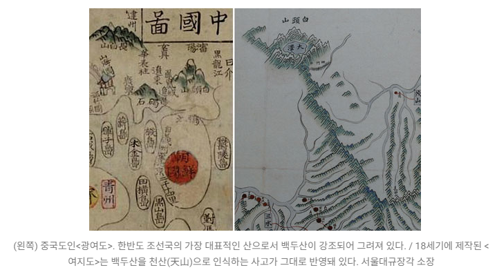 장백산이라는 이름은 중국 지도에서 나타나는 명칭이다. 광여도, 중국도에는 장백산과 함께 한반도를 대표하는 백두산이 함께 표기됐다(지도2).