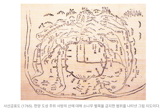 <경국대전>에는, 도성 사방의 산에 입산금지표를 세우고 벌목과 채석 등을 금하는 내용도 명문화했다. 1765년에 그려진 ‘사산금표도(四山禁標圖)’에는 도성을 중심으로 남산을 포함한 주위 네 산에 소나무 벌목(禁松)과 매장을 금지(禁葬)하는 범위가 그려져 있다.