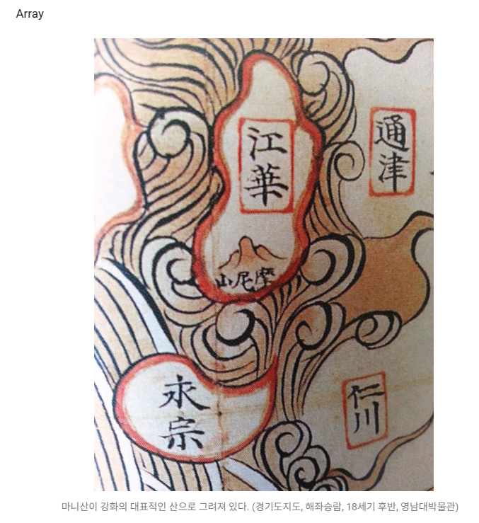 18세기 후반에 그려진 <경기도 지도>를 보면 마니산만 홀로 그려져 있다(지도3). 1840년에 한산거사(漢山居士)가 쓴 한양가(漢陽歌)라는 가사에도 ‘강화의 마니산이 도(都) 수구(水口) 되었에라’라고 읊었다.
