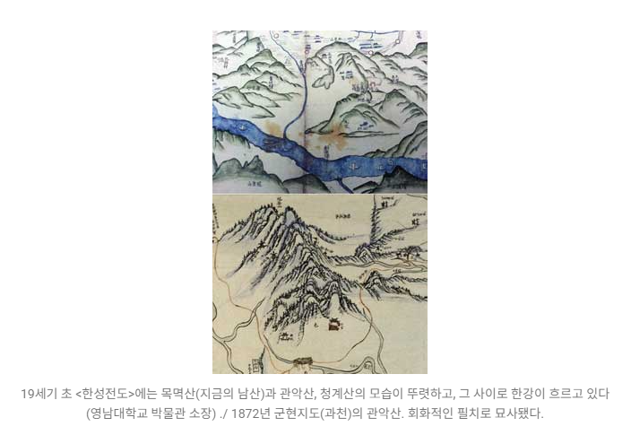 <대동여지도>를 보면 한눈으로 파악할 수 있다(지도4). 청계산으로부터 연원하는 관악산의 산줄기가 동쪽으로는 우면산으로 뻗고, 서쪽으로는 금지산으로 뻗는다.