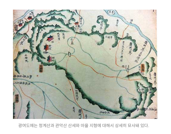 그래서 한양 도성도에서도 관악산은 그려졌다. <광여도>를 보면, 삼각산으로 둘러친 서울(京)을 중심으로 남쪽에 목멱산(남산)과 관악산이 일직선의 수직축으로 표현되고 있다(지도5).