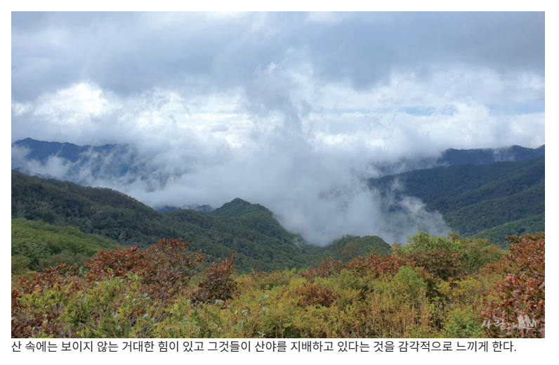 때에 따라서는 흰 눈으로 덮힌 심설 산행을 하며 길을 잃고 헤메다가 도저히 진행할 수가 없어 되돌아서기를 여러차례 반복하기도 한다. 구름과 휘몰아치는 광풍 그리고 폭우와 심설은 과연 산 그 자체에서 생성되는 것인가?