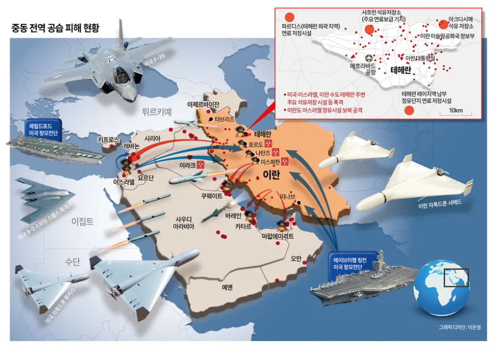 - 이란은 이스라엘 전역, 중동 내 미군 기지, 미 동맹국을 향해 미사일·드론 공격을 하며 대응했고, 호르무즈 해협을 사실상 봉쇄해 국제 유가가 급등함.